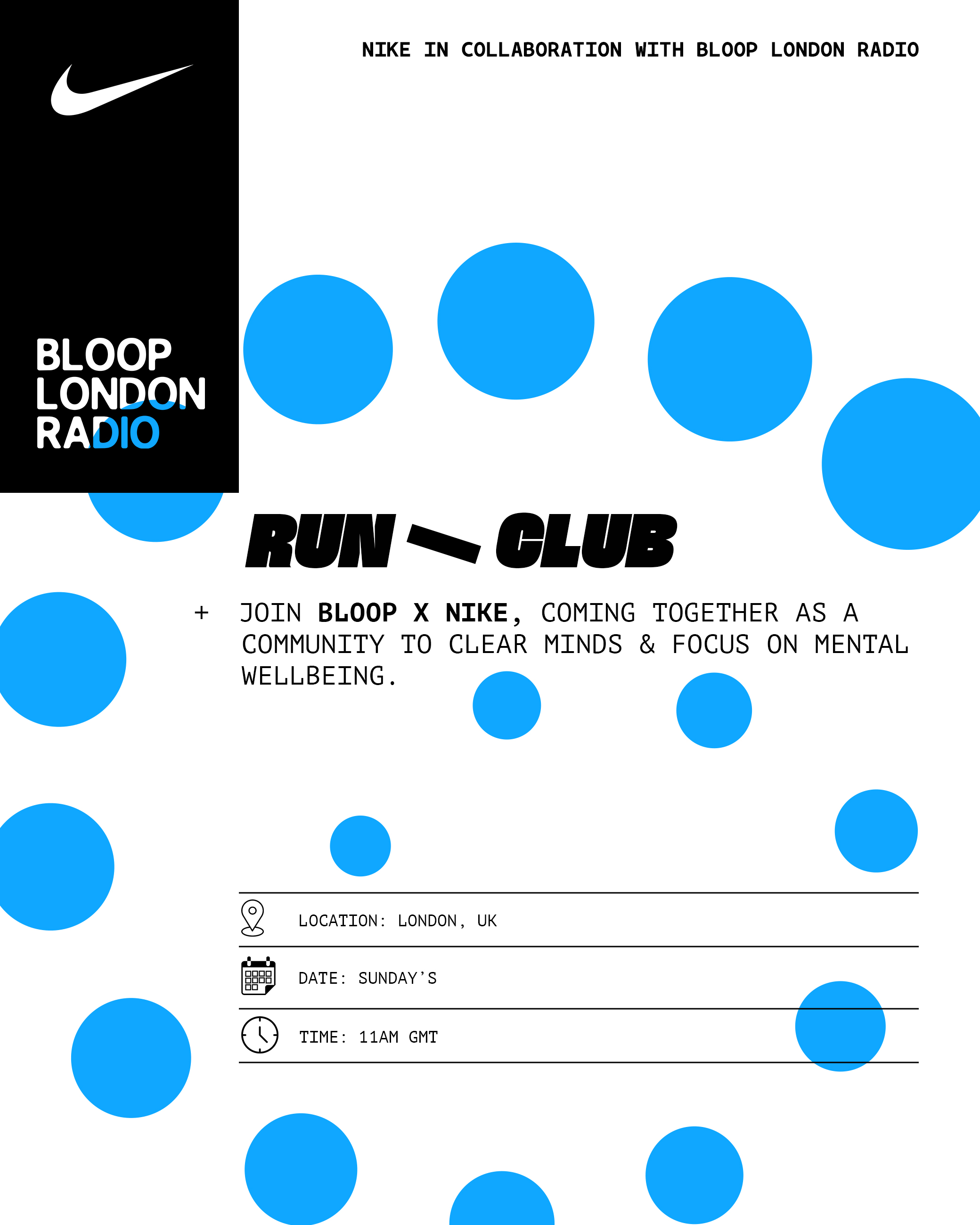 Identity for a series of Run Clubs with London radio station Bloop, where I designed a flyer for online and a t-shirt to be worn by runners at the club.